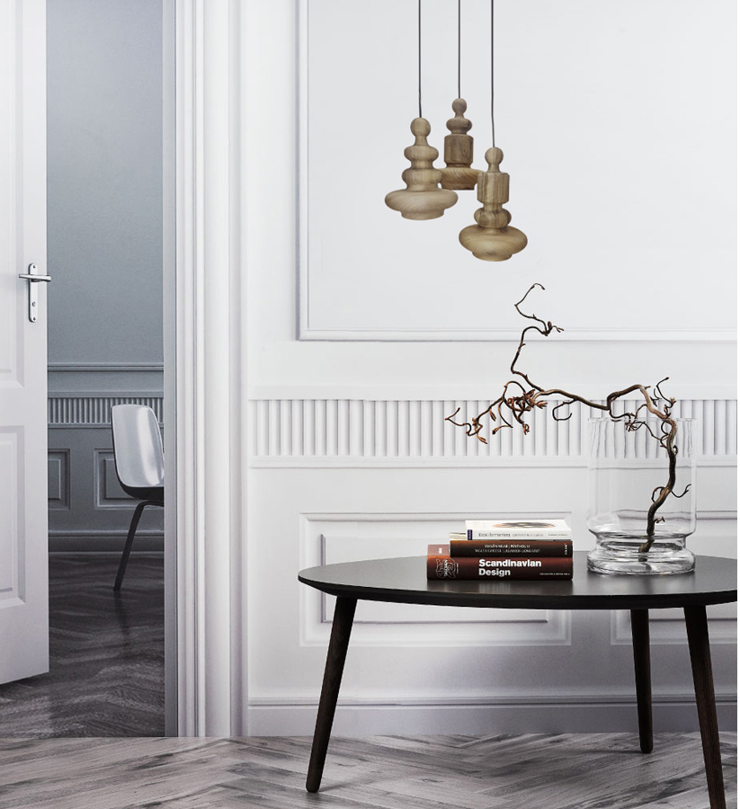Las formas relativamente simples de los colgantes individuales están diseñados para ser colocados en un grupo, creando una forma escultórica compleja.